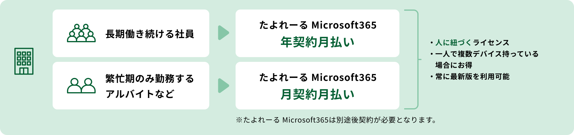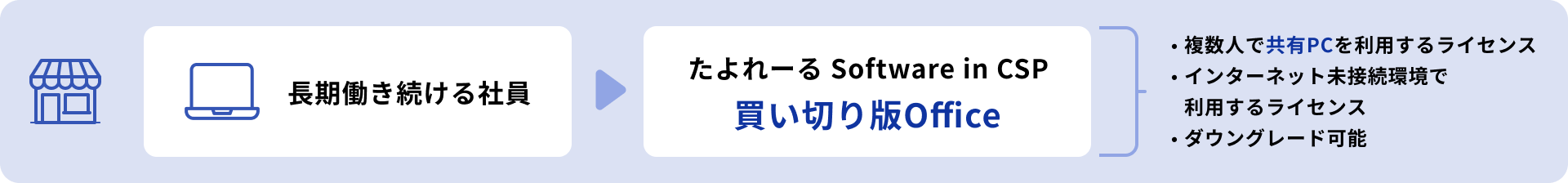 従業員のOfficeは「たよれーるMicrosoft 365」で、共有PCやインターネットに接続できない特定の条件の場合のみ「たよれーるSoftware in CSP」で、というように混在利用可能です。大塚商会はどちらもご提供可能です。